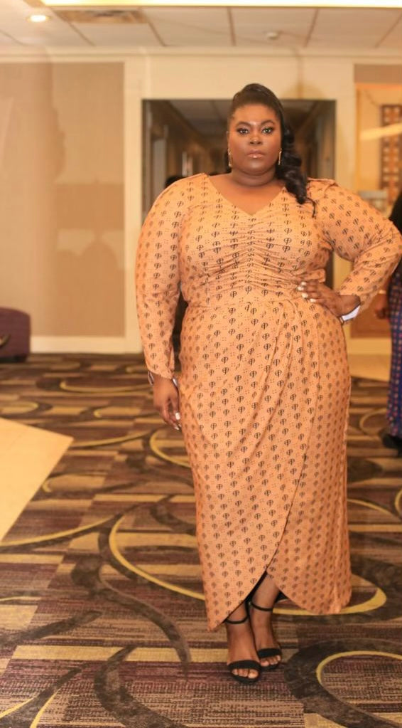 Give those curves a great big hug with this one of a kind dress! If you want to create a defined silhouette while highlighting all those assets, then you'll want to grab this piece. (NAME) is wearing this signature dress made with thicker, more shape-retaining fabric for a smooth finish that will keep everything perfectly in place. This dress is finished with a ruffled v-cut skirt for a gorgeous and classic outline