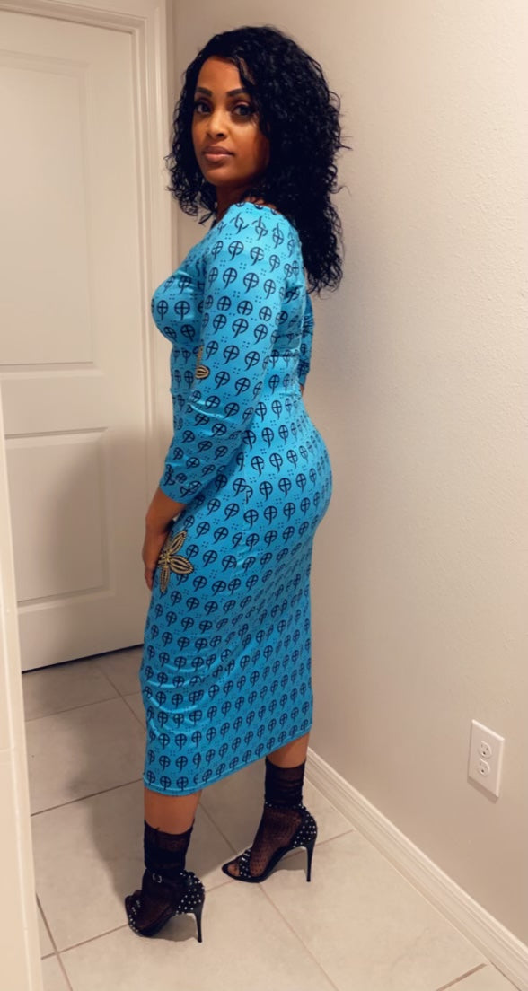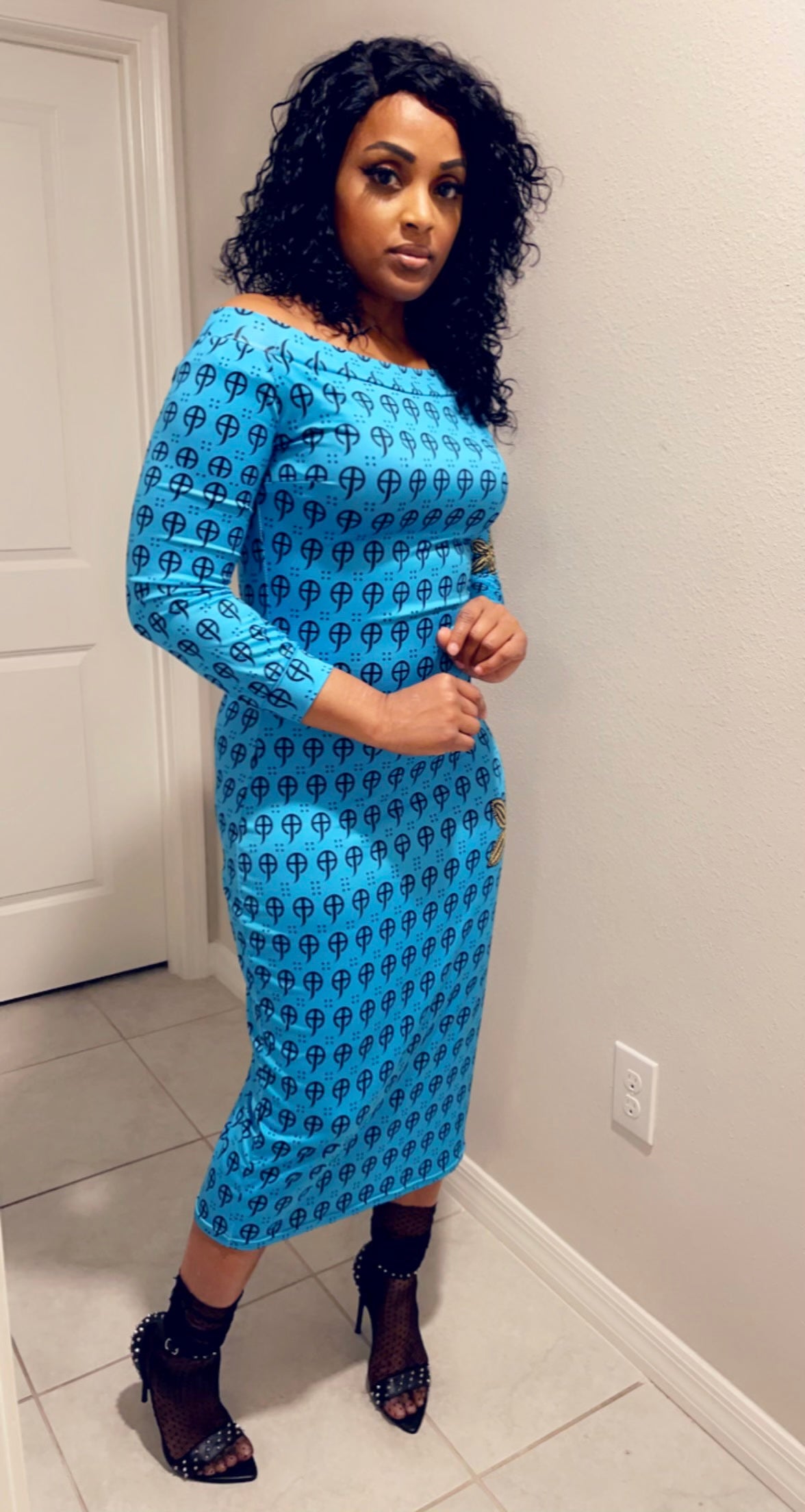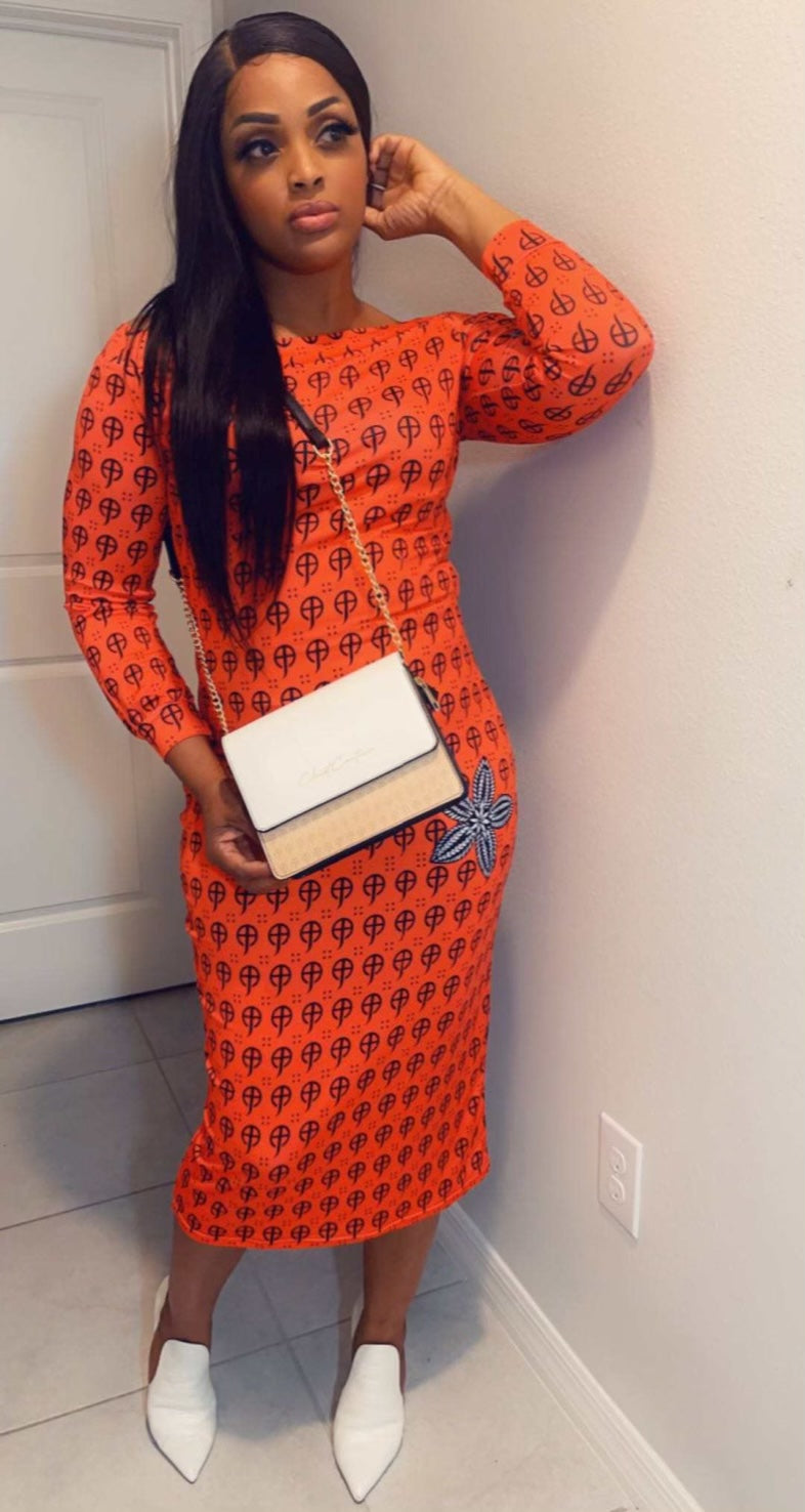 Our Rachel dress features bodycon fit, midi length, off shoulder style with flowers detailing. You can’t hide in crowd with this doll this style is flattering while boasting the intriguing combination of its signature logo print and curve-clinging fit.